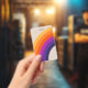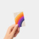 Abstract illustration of retro style rainbow design in yellow, purple, blue, and orange colours on beige background