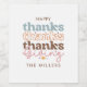 Groovy Thanksgiving design with blue, brown, orange, and pink tones. Customizable family name.