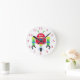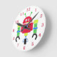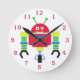 Children's wall clock done in white, with cartoon graphics of a red, green, blue and yellow robot, with red numbers for the hours. Customize to add your own text. Matching products are available.