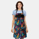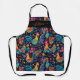 Modern apron with a colourful floral rooster pattern on a black background and a feminine, hand lettered script name. Personalize with your name.