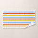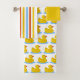 Fun colourful children's bathroom towel set, with the bath towel done in a pattern of yellow rubber duckies. The hand towel is done in yellow blue and orange stripes and the wash cloth is a solid yellow. Customize to add any text you want.