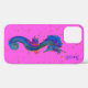 Pink iPhone case with graphics of a colourful sea horse, with faux gold glitter on the background. Personalize the blue name to suit your needs.