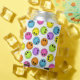 Orange, pink, purple, green, blue, and yellow smiling emoji faces on a white background cover this can cooler.