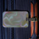 A luggage tag covered in a bright, clearly visible colourful smudge.