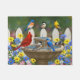 A spring gathering of colourful birds and flowers around a pretty water fountain birdbath.
