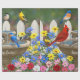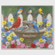 A spring gathering of colourful birds and flowers around a pretty water fountain birdbath.