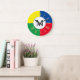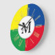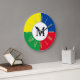 This stylish custom wall clock features a vibrant, colourful, modern design. Each corner features a different bright colour. Blue, red, green, and yellow frame a sample monogram initial in the centre. You can personalize the clock to include your own custom initial or other text. THe hours are printed in a gold Roman numeral pattern.