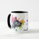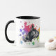 A watercolor image of a beautiful black Great Dane emerges from a collage of colourful stars on this mug. Star colours include pink, blue, teal, yellow, and green. The image is printed on two sides, with your custom text in black at the centre bottom between the images. Perfect for anyone who has lost their heart to a Dane!