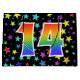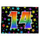 This exciting, fun, and vibrant gift bag design features a colourful star field pattern, along with the number "14" having a multicolored rainbow spectrum like gradient pattern, on a black coloured background. A gift bag like this might be a fun way to wrap presents or gifts being given for somebody’s fourteenth birthday, or perhaps for a couple’s fourteenth wedding anniversary, or some other 14th event. [~Z0000347]