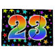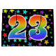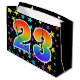 This exciting, fun, and vibrant gift bag design features a colourful star field inspired pattern, along with the number "23" having a multicolored rainbow spectrum like gradient pattern, on a black coloured background. A gift bag like this might be a fun, happy way of wrapping gifts or presents being given for somebody’s twenty third birthday, or perhaps for a couple’s twenty third wedding anniversary, or some other 23rd event. [~Z0000347]