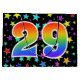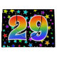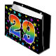This exciting, fun, and vibrant gift bag design features a colourful star shapes pattern, along with the number "29" featuring a multicolored rainbow spectrum like gradient pattern, on a black coloured background. A gift bag like this might be a fun, happy way of wrapping gifts or presents being given for somebody’s twenty ninth birthday, or perhaps for a couple’s twenty ninth wedding anniversary, or some other 29th event. [~Z0000347]