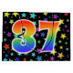This exciting, fun, and vibrant gift bag design features numerous colourful star shapes, along with the number "37" featuring a multicolored rainbow inspired spectrum gradient pattern, on a black coloured background. A gift bag like this could perhaps be a fun way to wrap presents or gifts being given for somebody’s thirty seventh birthday, or perhaps for a couple’s thirty seventh wedding anniversary, or some other 37th event. [~Z0000347]