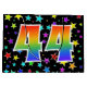 This exciting, fun, and vibrant gift bag design features a pattern of colourful star shapes, along with the number "44" having a multicolored rainbow inspired spectrum gradient pattern, on a black coloured background. A gift bag like this could perhaps be a fun way to wrap presents or gifts being given for somebody’s forty fourth birthday, or perhaps for a couple’s forty fourth wedding anniversary, or some other 44th event. [~Z0000347]