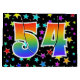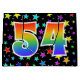 This exciting, fun, and vibrant gift bag design features a colourful star field pattern, along with the number "54" having a multicolored rainbow spectrum like gradient pattern, on a black coloured background. A gift bag like this could perhaps be a fun way to wrap presents or gifts being given for somebody’s fifty fourth birthday, or perhaps for a couple’s fifty fourth wedding anniversary, or some other 54th event. [~Z0000347]
