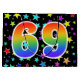 This exciting, fun, and vibrant gift bag design features a colourful stars pattern, along with the number "69" having a multicolored rainbow inspired spectrum gradient pattern, on a black coloured background. A gift bag like this could perhaps be a fun and happy way of wrapping gifts or presents being given for somebody’s sixty ninth birthday, or perhaps for a couple’s sixty ninth wedding anniversary, or some other 69th event. [~Z0000347]