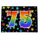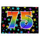 This exciting, fun, and vibrant gift bag design features many colourful star shapes, along with the number "75" featuring a multicolored rainbow inspired spectrum gradient pattern, on a black coloured background. A gift bag like this might be a fun way to wrap presents or gifts being given for somebody’s seventy fifth birthday, or perhaps for a couple’s seventy fifth wedding anniversary, or some other 75th event. [~Z0000347]
