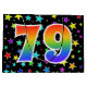 This exciting, fun, and vibrant gift bag design features numerous colourful star shapes, along with the number "79" featuring a multicolored rainbow inspired spectrum gradient pattern, on a black coloured background. A gift bag like this might be a fun way to wrap presents or gifts being given for somebody’s seventy ninth birthday, or perhaps for a couple’s seventy ninth wedding anniversary, or some other 79th event. [~Z0000347]