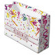 Whatever the occasion, be sure to wrap things up with gift bag design. Colourful streamers and confetti decorate the bag. On the bottom, of the front and back, there's a banner with the word 'CELEBRATE'. Underneath the banner the is an area for additional text. All text in this design can be personalized.