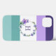 Colourful iPhone case done in bold colour block pattern of purples and aquas, with a pretty wreath in the middle with a single purple letter monogram. Personalize the one letter monogram, for yourself or as a great gift idea.
