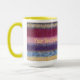 The original knitted design on this unusual mug has a very traditional hand knitted appearance, the knitted striped image on the mug has been taken from a photograph of an original hand knitted pattern. The original piece of colourful hand knitting has been photographed to show it looking natural and "pre loved" you may even see a few pet hairs! and there will be bobbly bits, stray threads and creases, this all makes up the natural look of a much loved hand crafted knitted mug. The knitted image gives the mug a vintage appearance. This is a customizable mug, you can personalize it with your own text.