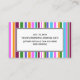 This card has been covered in a graphic featuring rich, bright colourful stripes . The palette features turquoise, green, orange, pink, purple, red and white. A white badge that's outlined in a slim black border masks the centre of the card on both sides, providing space for your details to show up perfectly. Text appears in black on both sides; you can change this, along with fonts and sizes, if you prefer. All details were added separately and left unlocked to give you maximum design control. Please don't hesitate to reach out if you need assistance. // Designed by Melody Watson for Paper Muserie.