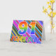 The front of this fun, eye-catching, and exciting birthday greeting card design features a multicolored stripes pattern, along with the message "91 years old!" having a multicolored rainbow inspired gradient pattern. The inside features a customized greeting message, or could perhaps be cleared and left blank if a message is to be written by hand instead. A greeting card like this might be a fun way to celebrate somebody’s ninety first birthday. [~Z0000351]