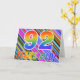The front of this eye-catching, vibrant, and fun birthday greeting card design features a colourful striped pattern, along with the message "92 years old!" having a multicolored rainbow like gradient pattern. The inside features a customized greeting message, or could perhaps be cleared and left blank if a message is to be written by hand instead. A greeting card like this could perhaps be a fun way to acknowledge somebody’s ninety second birthday. [~Z0000351]