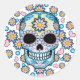 Sugar skull designed hues of blue and pink is surrounded by colourful flowers and hearts.