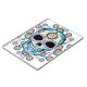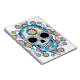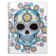 Sugar skull designed hues of blue and pink is surrounded by colourful flowers and hearts.