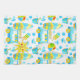 Colourful and joyful summer and beach objects pattern featuring illustration of ice-cream truck, beach ball, sand bucket, surf, ice-cream, water drops and a creative sun badge with a name monogram.