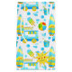 Colourful and joyful summer and beach objects pattern featuring illustration of ice-cream truck, beach ball, sand bucket, surf, ice-cream, water drops and a creative sun badge with a name monogram.
