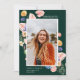 Colourful bright summer floral and greenery arrangements, graduation announcement and invitation. Card features, emerald green background colours, single front framed photo with 3 additional photo spaces on back.