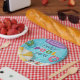 Destei's colourful illustration of a blue summer swimming pool scene. In the pool there is a purple swimming mattress, a green swimming ring and a pink swimming ring. On the bottom of the design there is a white tile floor and on it there are some items. The items are an orange drink with a straw, black sunglasses, yellow and white striped sun shade umbrella and a plate of fruits. The fruits include a watermelon slice, an orange slice and three strawberries. The front reads: "Pool Party" in colourful lettering over the pool water. Above that text there is a personalizable text area for the name of the host, for example.