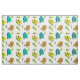 Colourful teardrop camper trailer fabric with repeating tossed pattern of camper trailer images in orange, yellow and teal blue. Accented with green leaf shaped trees.