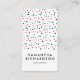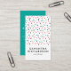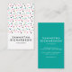A fun, colourful, but yet professional vertical business card, featuring a pattern of scattered triangles, with white space in bottom third of the card giving name and service details. The reverse side has a fun teal background, with business and contact details in white modern font. This design is great for event planners and any other professional.