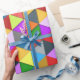 Many triangles in yellow, orange, red, pink, blue, green colours creating fun modern geometric pattern.