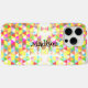 Colourful triangle retro geometry pattern Monogram iPhone 15 Case. Personalize with your initial and name. Unique custom gift for all. Many triangles in yellow, orange, red, pink, blue, green colours creating fun modern geometric pattern.