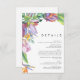 This colourful tropical floral | detail enclosure card is perfect for your modern boho destination, green, purple, peach wedding. Design features an elegant bouquet of classic beach watercolor greenery and flowers that may include sage green eucalyptus, mauve and red protea, blush pink hibiscus, orange and blue bird of paradise, and dark green palm leaf. The design is ideal for a simple, creative, unique travel wedding for spring, summer, fall, or winter! Please find other matching or coordinating wedding stationery in the rest of the collection.
