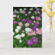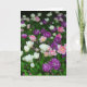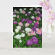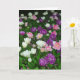 A card with a photo of tulips in white, pink and purple interspersed with other little flowers and leaves. The inside of the card has been left blank which can be further customized or left blank to write a personal message.