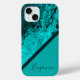 This iPhone 15 case is for marble design lovers. The design has an abstract turqouise + black marble design with a turqouise triangle and a dark black stripe . A simple and cool design for your personal statement. It is customizable with your name or monogram.
