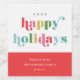 A whimsical holiday wine label featuring colour happy holidays message for a fun, light hearted, festive vibe.