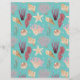 Colourful watercolor illustrations of seashells, coral and underwater plant life create a pattern on aqua background. One side is larger pattern