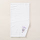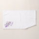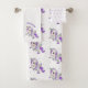 Sweet personalized girl's bathroom towel set featuring a colourful flying unicorn with purple ombre mane and tail and purple star accents. Personalize the purple name, on the washcloth to suit your needs.