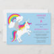 A cute white unicorn with pink, blue, and yellow striped mane and tail rears playfully on the front of this fun birthday party invitation. Behind the unicorn is a matching rainbow between two white clouds. Your custom text is in pink and dark blue at the right of the images. Everything is placed on a pastel blue background. The back of the invitation is the same blue colour, with pink, lavender, and white confetti. Cute for ages 1 through 8; just customize it! graphics by Prettygrafik Design, © Prettygrafik.com