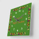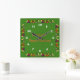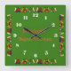 This square clock has been designed for a vegan kitchen. It has a vivid green background, white numbers and is decorated with colourful vegetables. You can personalize it with your name and words.