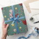 Christmas theme wrapping paper featuring colourful hand-drawn holiday symbols with red gold and forest green colours.