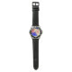A watch with a colourful background.