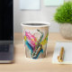A watercolor painting of a colourful splash with a saxophone in the centre. The splash has shades of blue, purple, and yellow. The background is a calm body of water with a reflection of the sky and the surroundings. The sky has clouds and is painted with a gradient of blue and purple.