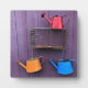 Cute & colourful watering cans against a purple painted wood panel wall. Very cute & creative garden decor!