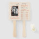 These fans were exactly as pictured. The quality is great. Perfect favor for a wedding!...I will make assembly a little easier by using a hot glue gun and finish them off with a ribbon. Beautifully printed. Crisp and clear text.
